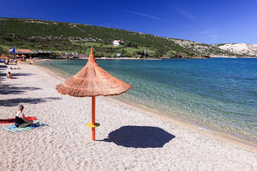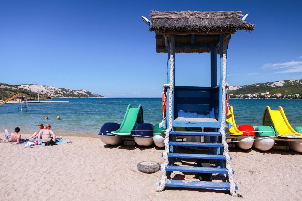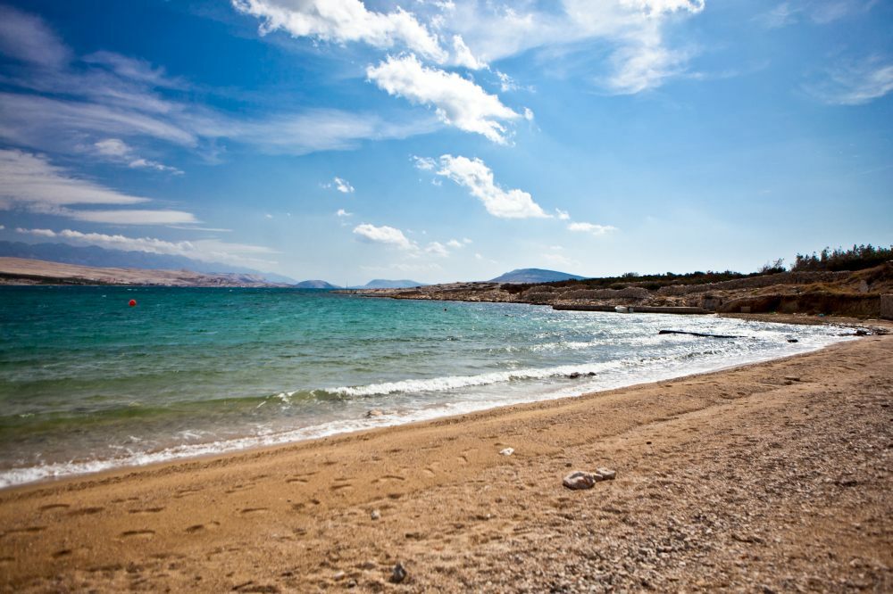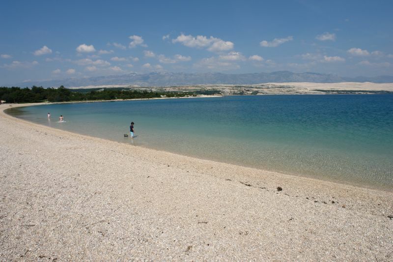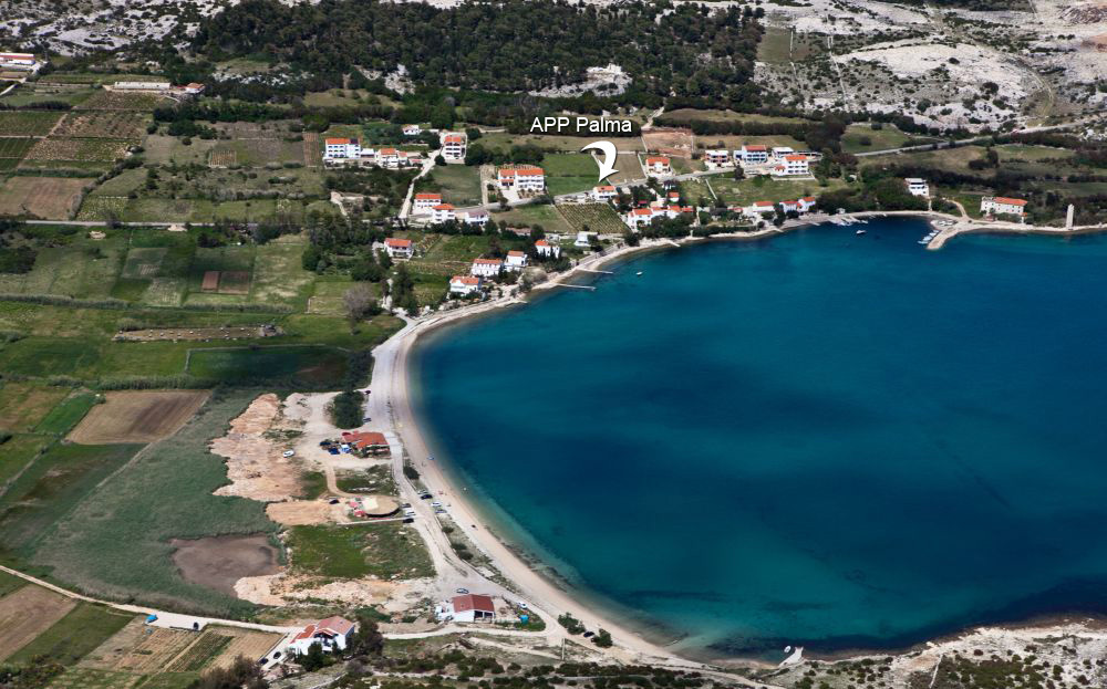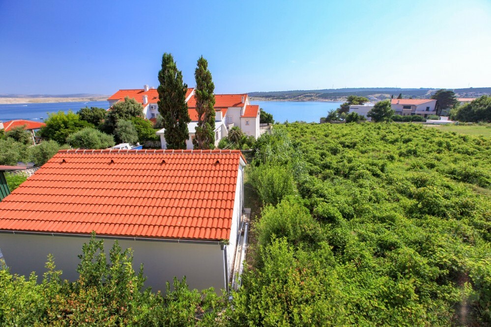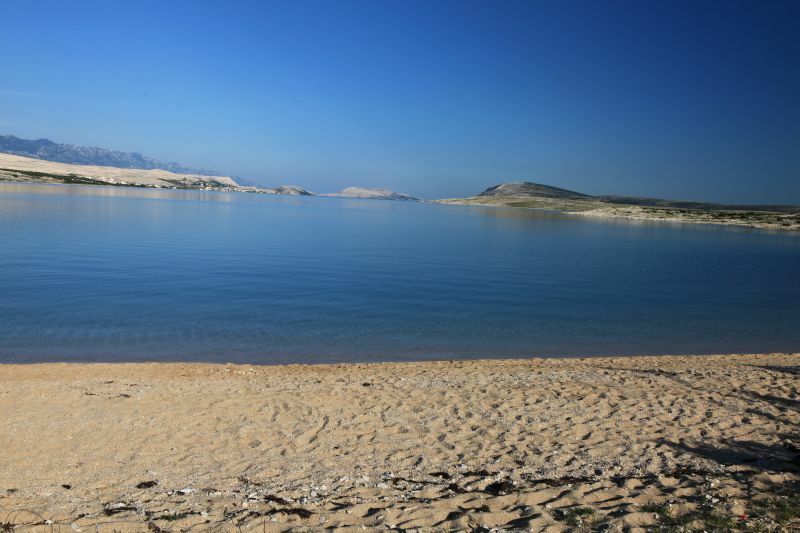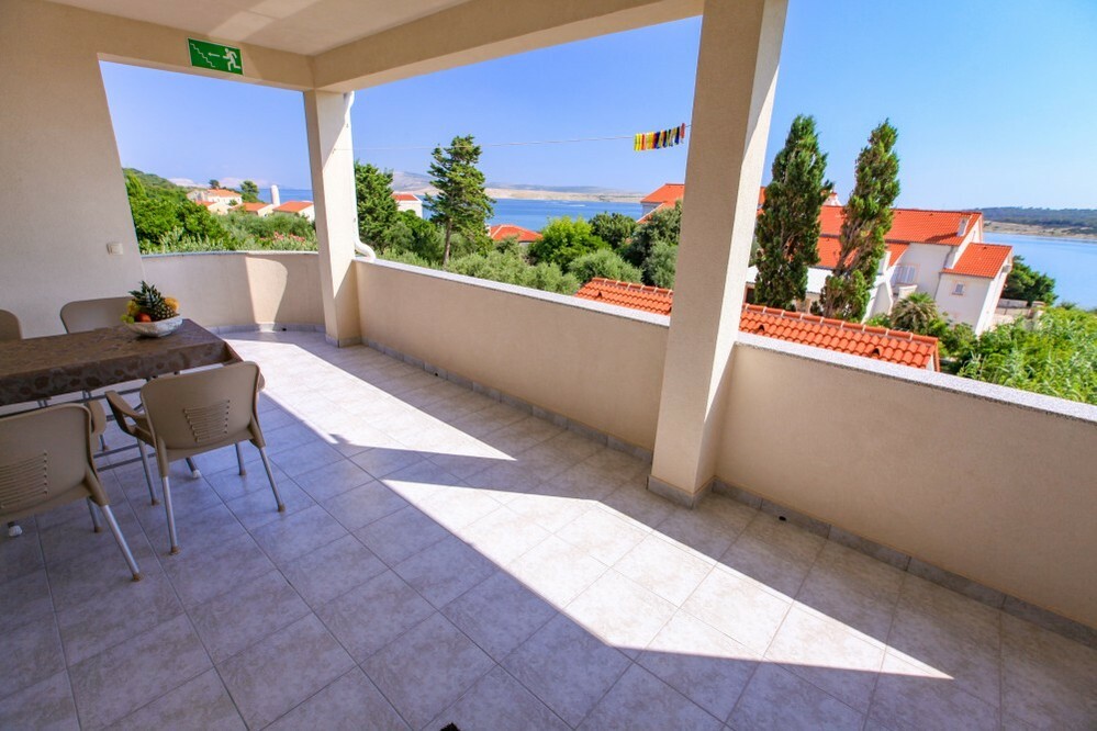 Komfortně vybavený apartmán s velkou zastřešenou terasou, s výhledem na moře, 200 m od písečné pláže na ostrově Pag v Chorvatsku.
