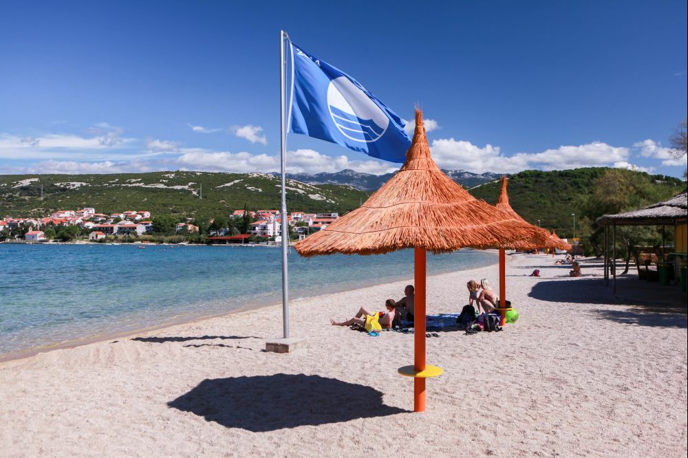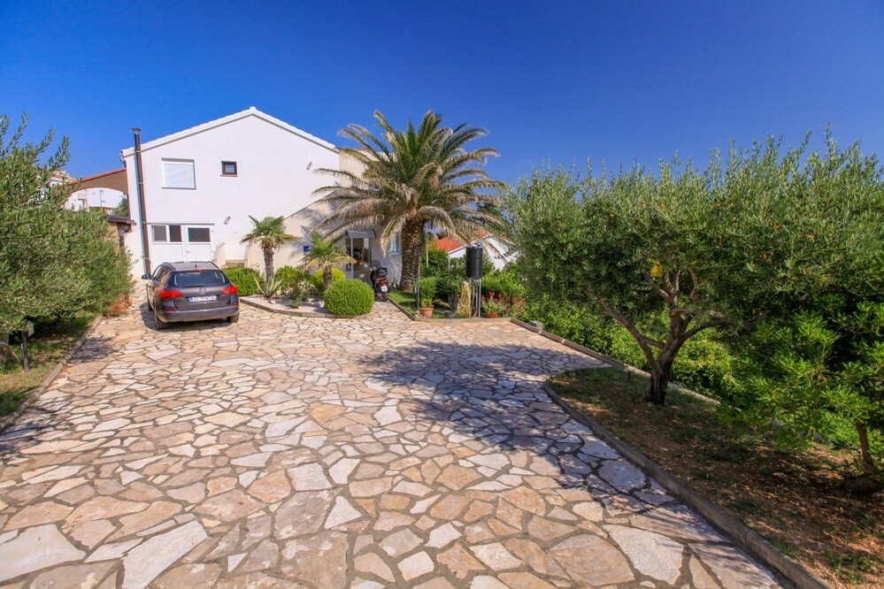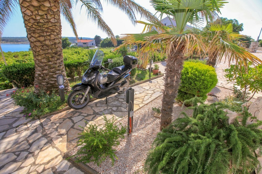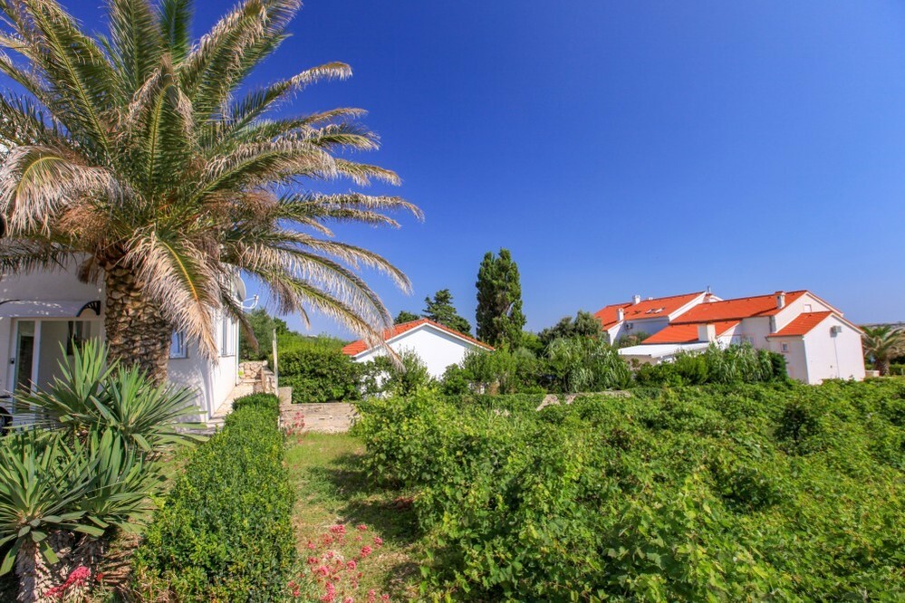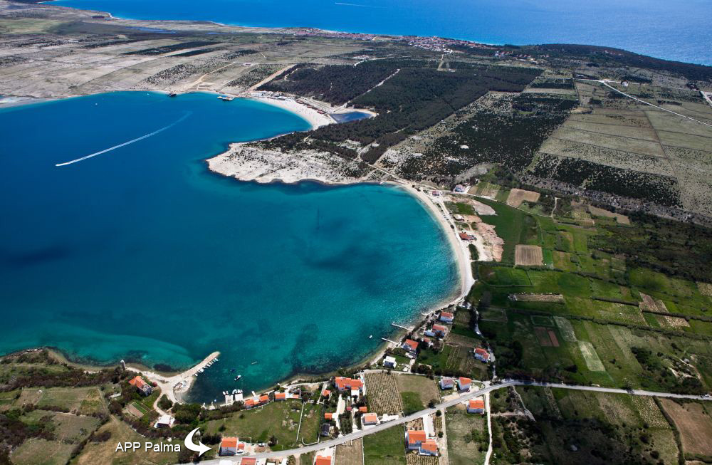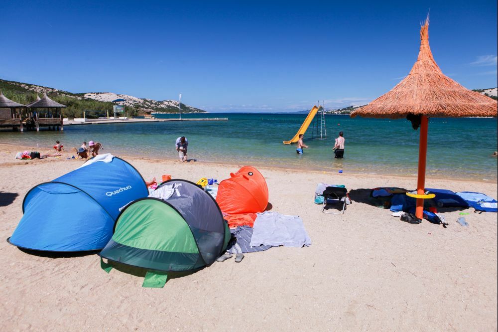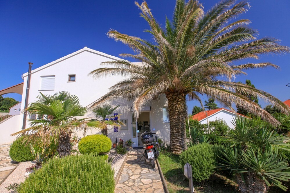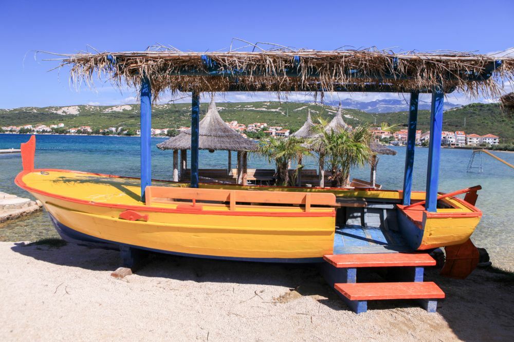 Komfortně vybavený apartmán s velkou zastřešenou terasou, s výhledem na moře, 200 m od písečné pláže na ostrově Pag v Chorvatsku.