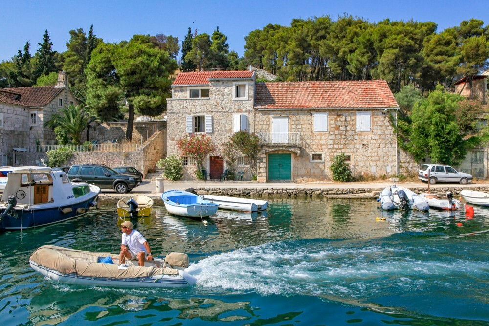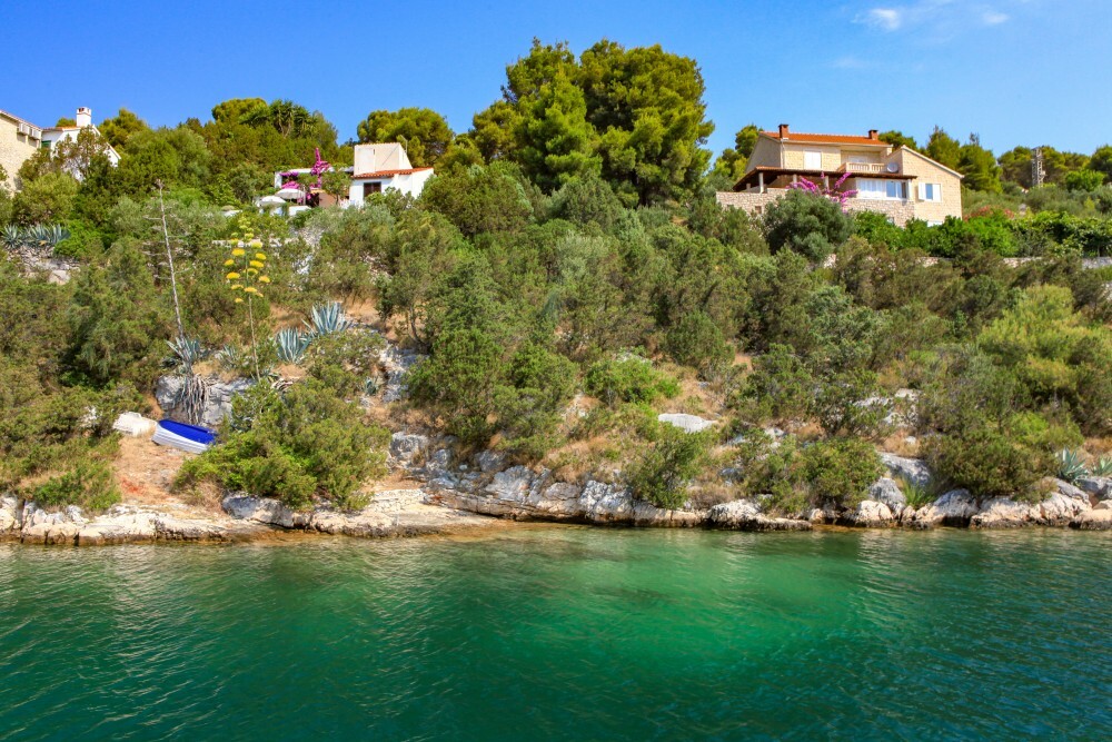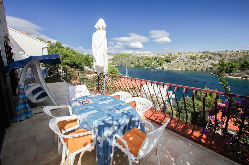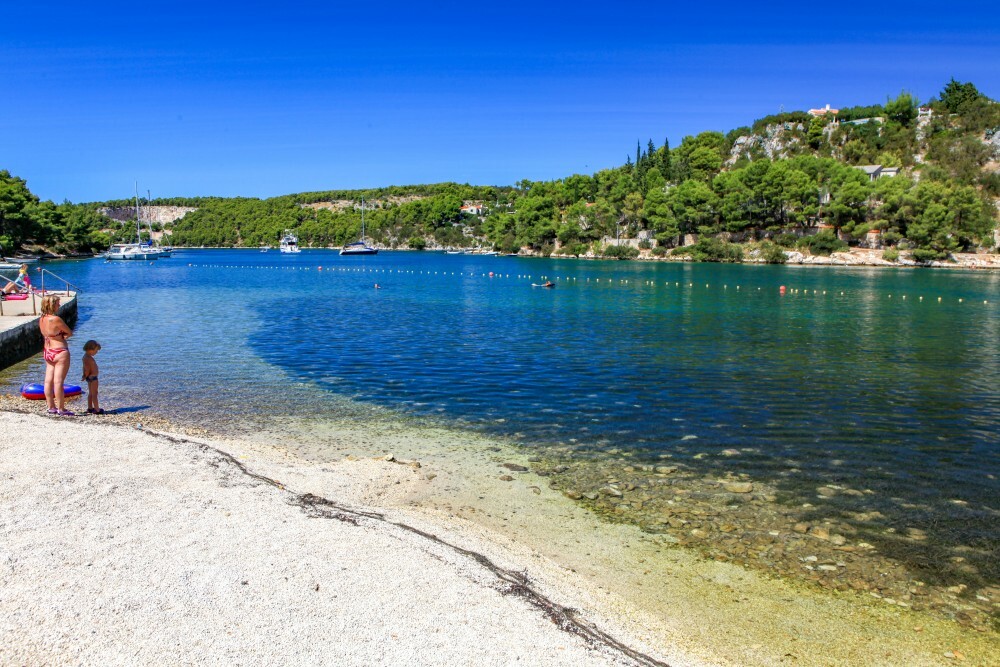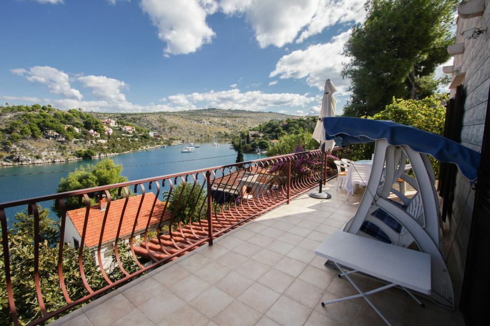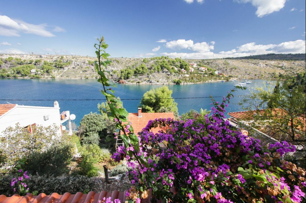 Velmi pěkný apartmán se zastřešenou terasou s výhledem na zátoku, 400 m od oblázkové pláže na ostrově Brač v Chorvatsku.