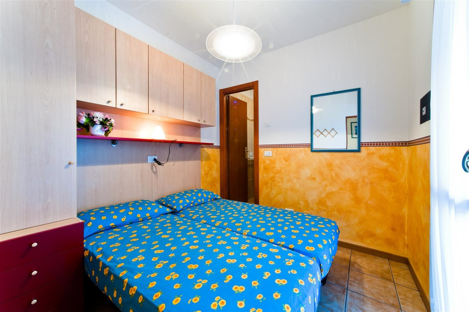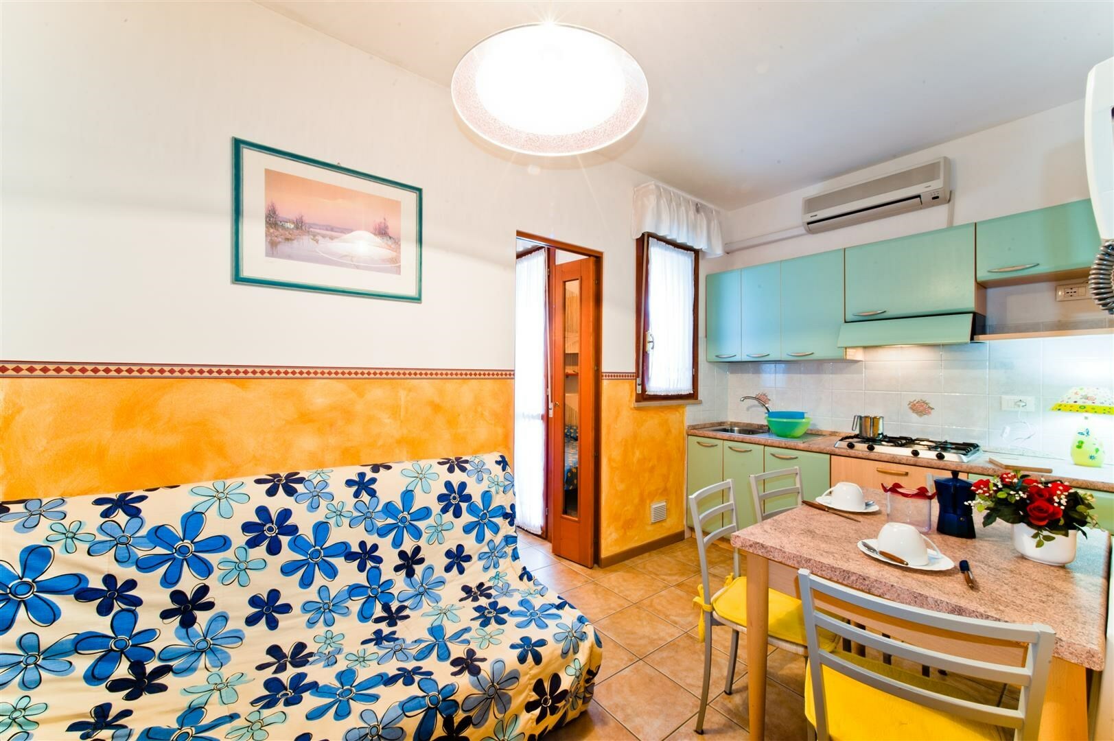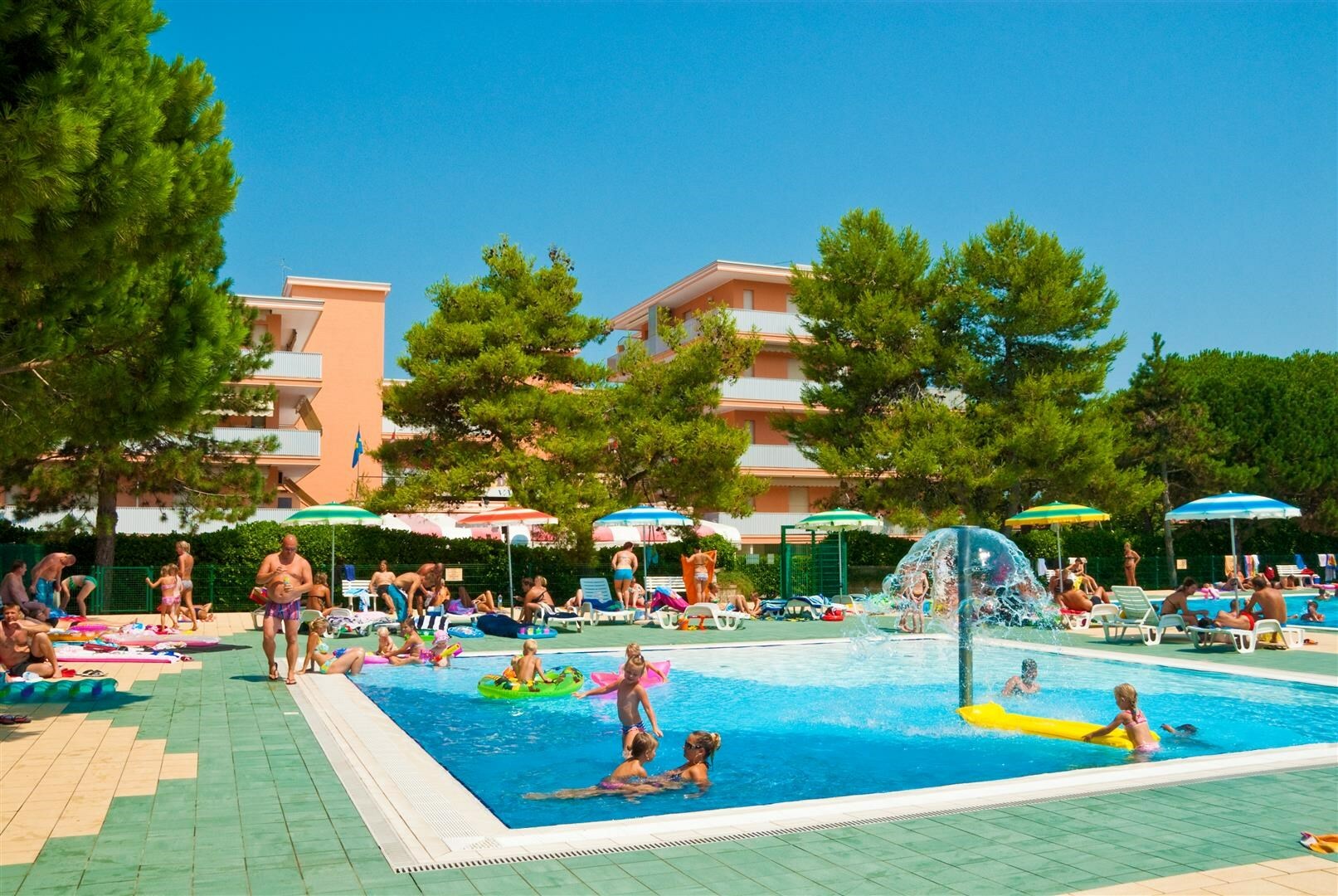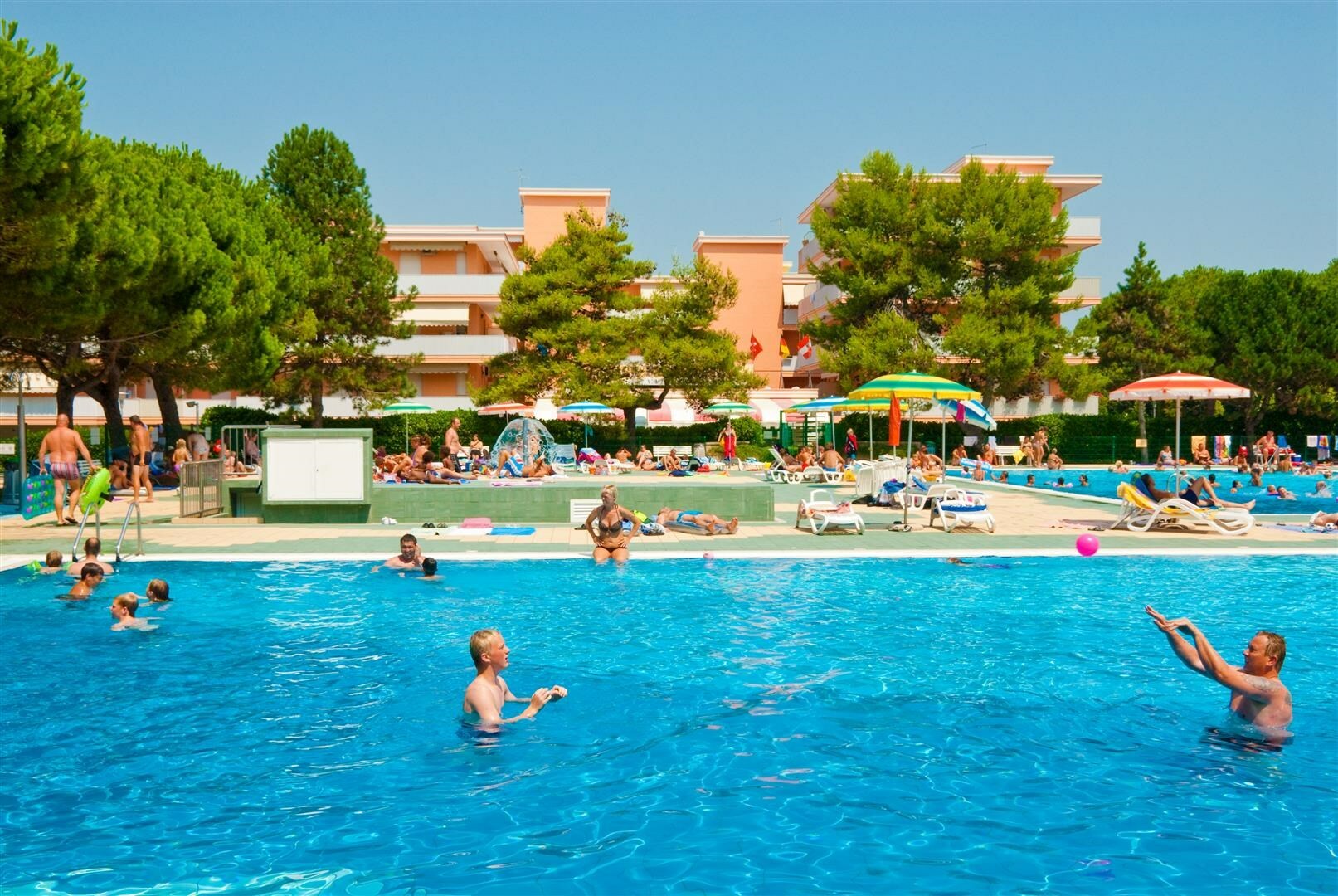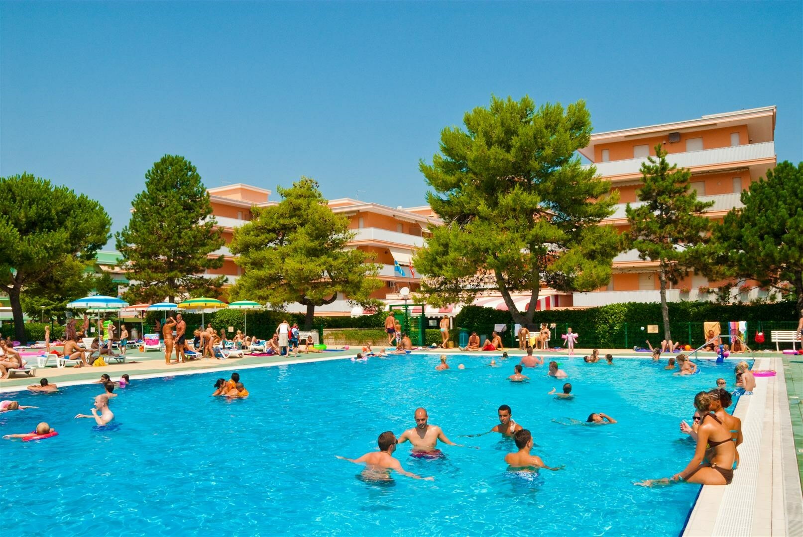 Pěkně vybavený apartmán v patře apartmánového domu s venkovním bazénem a dětským bazénem, 1 km od pláže Jadranského moře v provincii Benátky v Itálii.